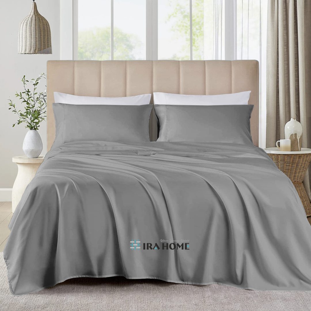 100% Organic Bamboo 4 Piece Sheet Set For King Size Bed (Grey)