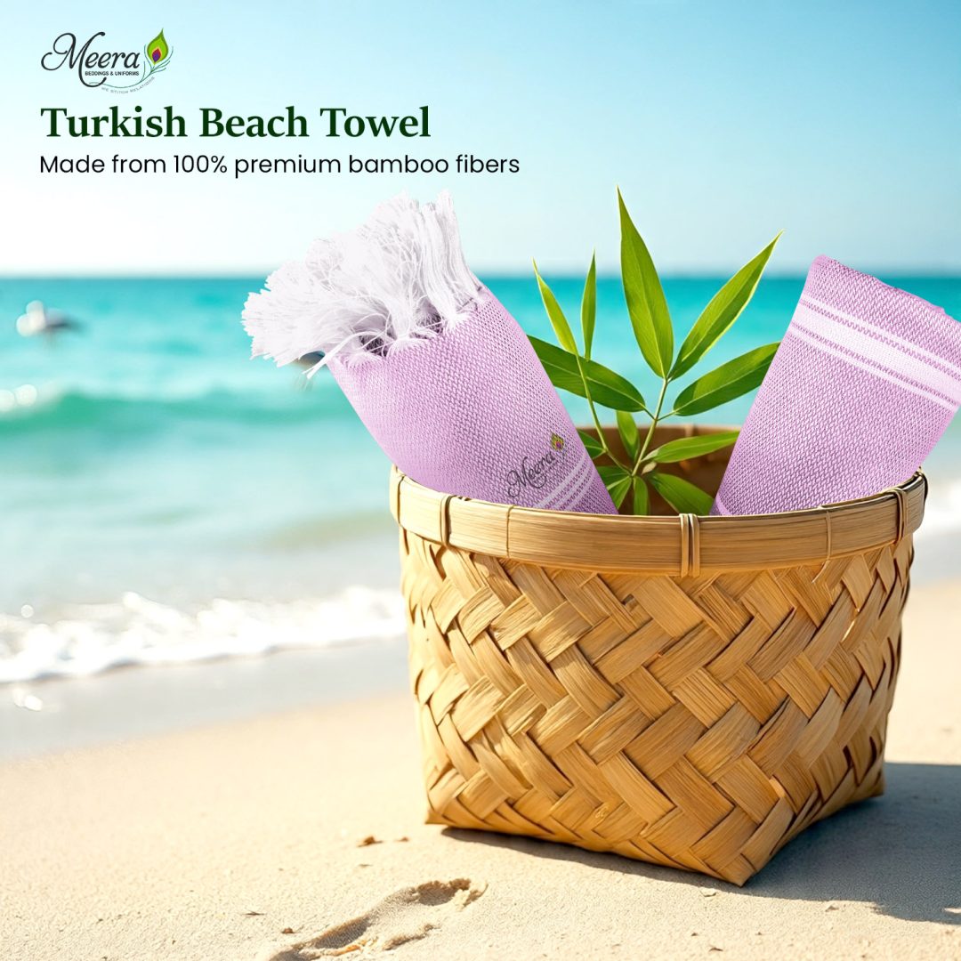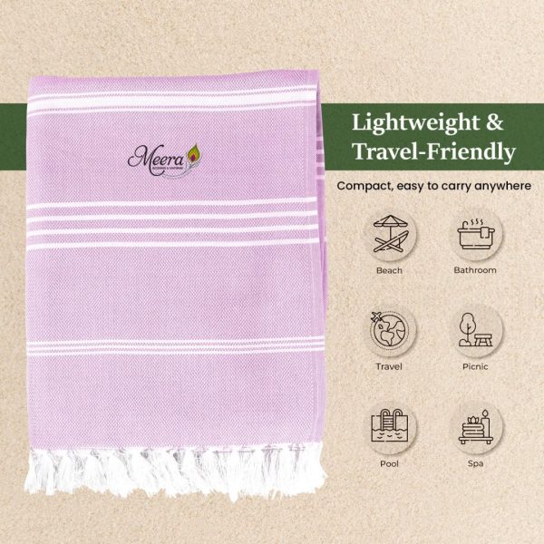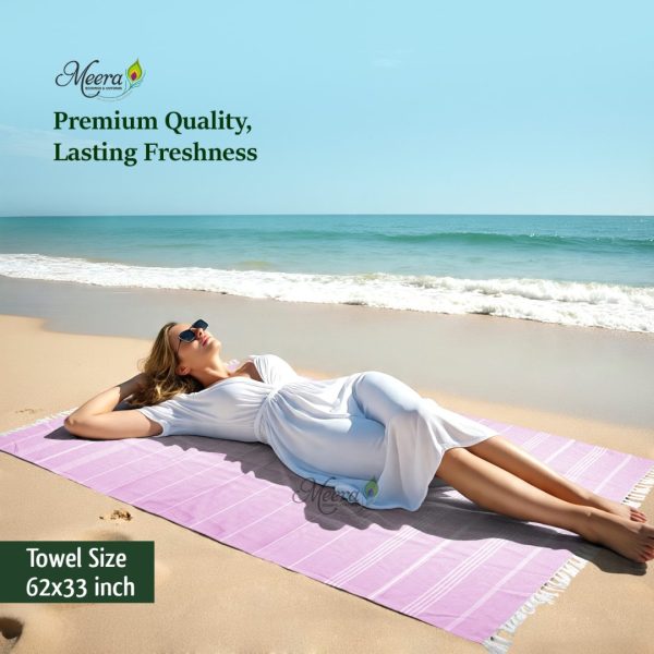 Brighten up your beach days with the Meera Beach Towel in purple. Made from soft, absorbent cotton with stylish stripes and fringed edges, it’s lightweight, quick-drying, and perfect for seaside lounging or poolside comfort.