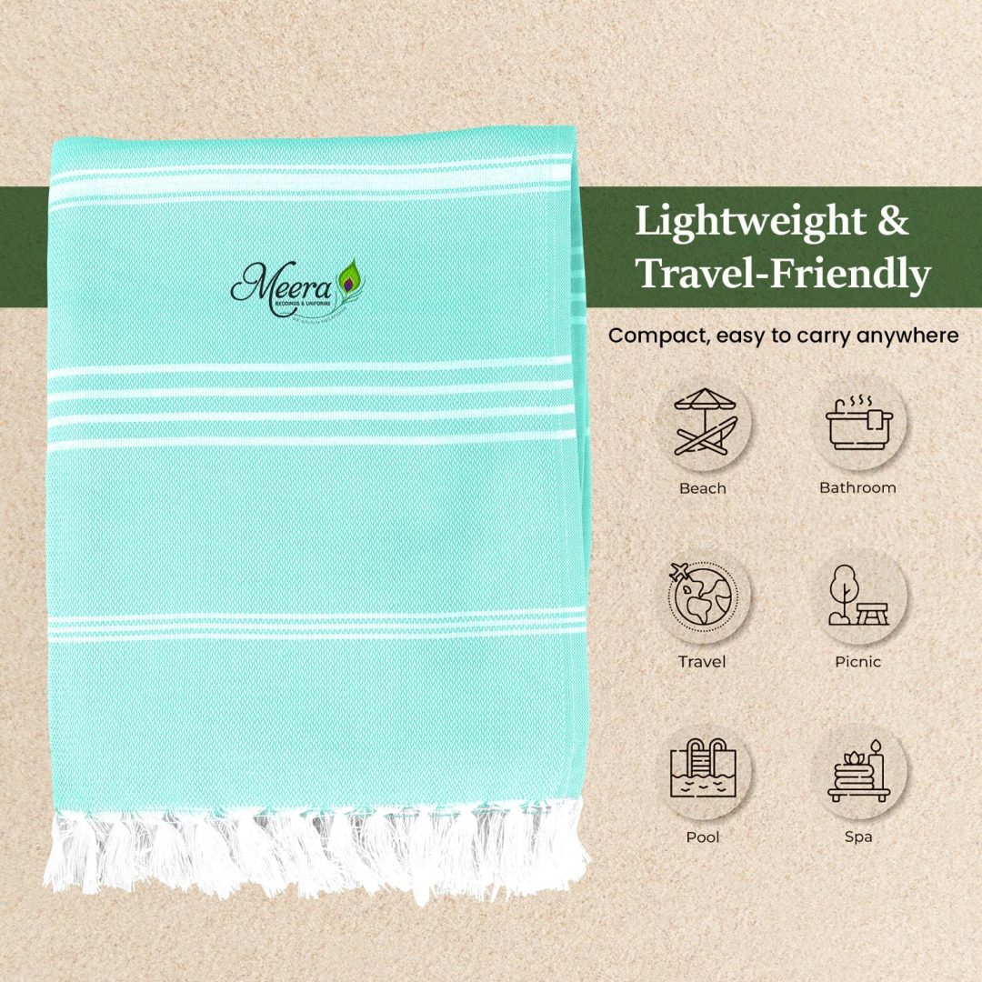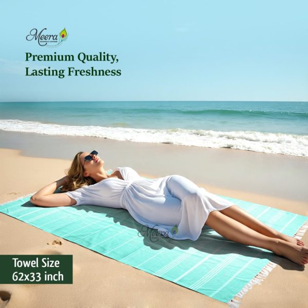 Dive into comfort with the Aqua Blue Meera Beach Towel. Soft, lightweight, and highly absorbent, it’s ideal for beach trips, poolside lounging, or spa days. Its calming aqua blue shade brings a refreshing touch to your summer essentials.